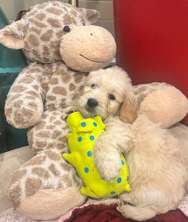 Puppies are all trained for calmness getting an early start to being a well-mannered doodle. This all starts at 5 weeks of age, working with puppies before they go into new homes makes a huge difference in temperament and respect towards humans.